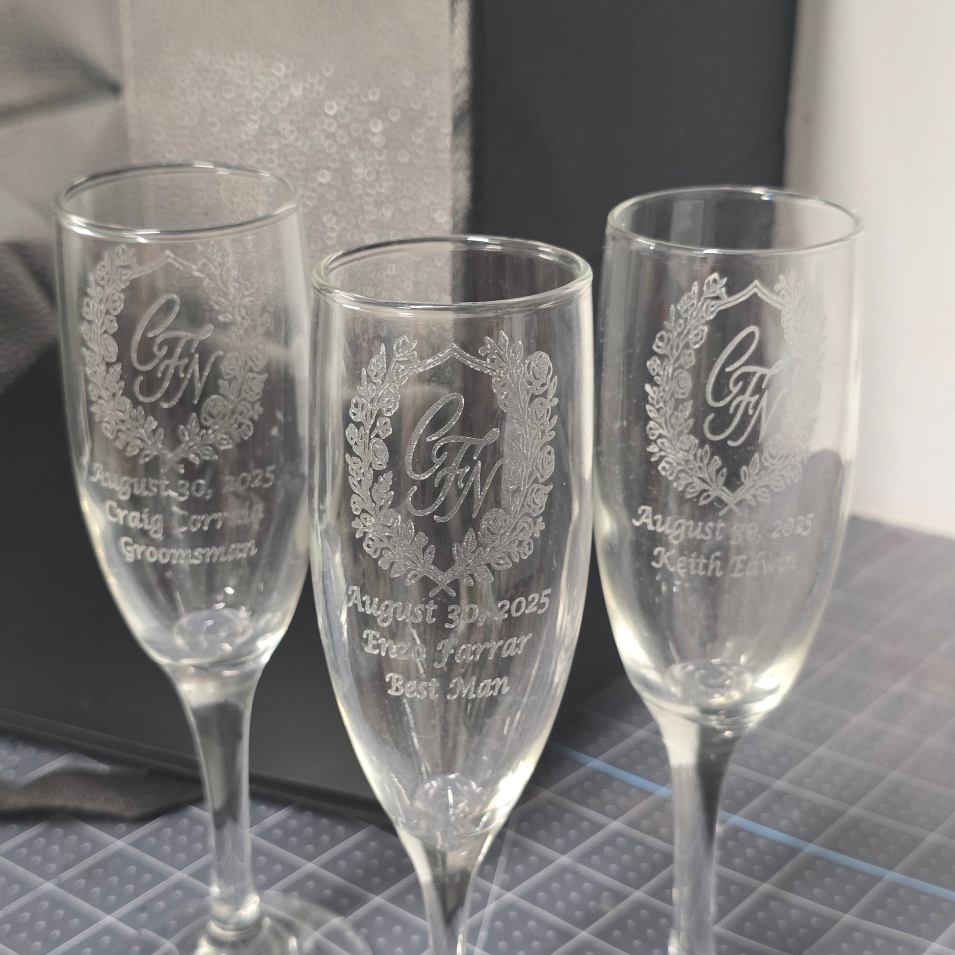 Celebrate in style with these elegant etched champagne glasses – perfect for weddings, anniversaries, birthdays, or any special occasion. Each glass is carefully laser-etched with your choice of design, name, date, or phrase, creating a timeless keepsake that won’t fade or wash away.