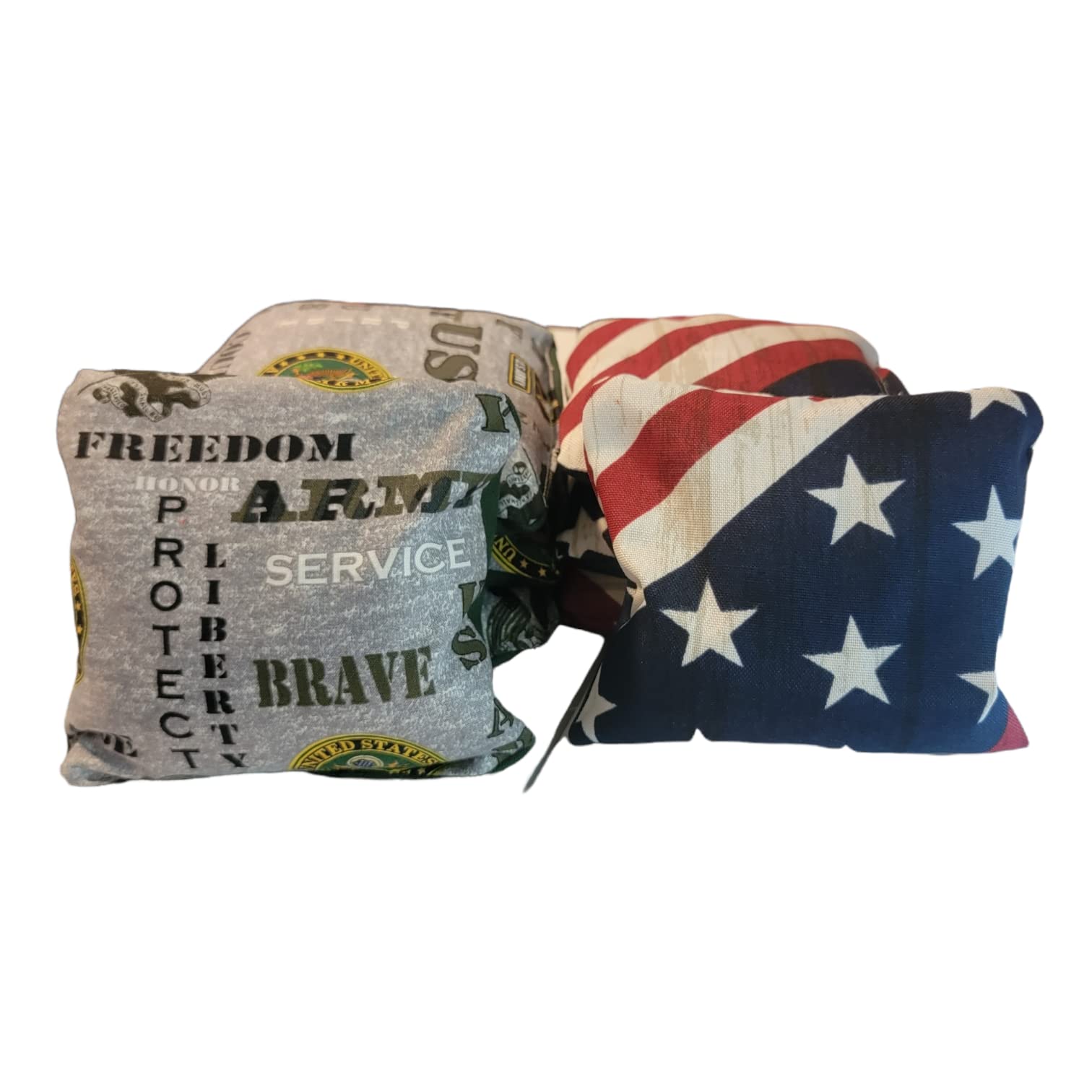This set comes with 4 United States Army and 4 American Flag bags. It is made with cotton fabric top and duck cloth bottom Each bag is personally made by me with care and concern. I never give out a product I am not 100% satisfied with. Bags are filled with clean whole dried corn.